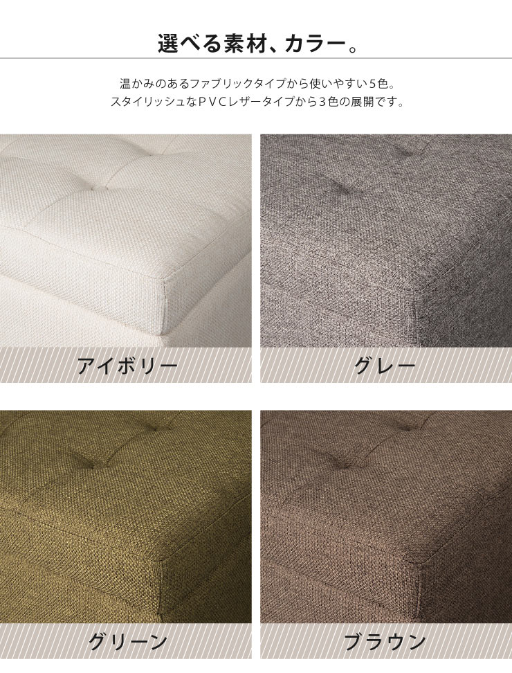 【サイズ】 外寸:W65cm×D50cm×H35cm 内寸:W55cm×D43cm×H23cm【構造材】天然木・合板 【貼り材 】ファブリックタイプ:ポリエステル生地 PVCレザータイプ:合成皮革 【クッション材】ウレタンフォーム【耐荷重】80kg【製品状態】完成品【生産国】中国※生産ロットにより、同じカラーでも多少の色差があることがございます。