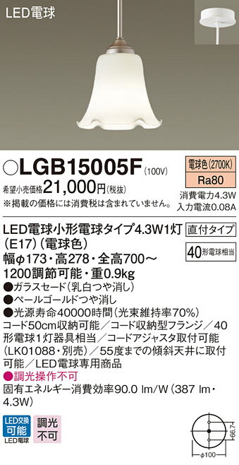 商 品 詳 細商品名インテリア 屋内 照明メーカー名パナソニック Panasonicメーカー器具名称ペンダントライト(吊り下げ照明)仕様商品詳細光源◆LED電球小形電球タイプ4.3W1灯(E17)(電球色) ◆色温度:2700 K ◆光源寿命40000時間(光束維持率70%)寸法・質量◆幅:φ173 mm ◆高:278 mm ◆全高:700〜1200 mm 調節可能◆質量:0.9 kg仕様・注意事項LED照明の安心品質◆器具光束:387 lm ◆電圧:100 V ◆消費電力:4.3 W ◆消費効率:90 lm/W◆デザイン分類:Modern Classic◆【ガラスセード】乳白つや消し◆キレイコート仕様(セード)◆Ra80◆コード50cm収納可能◆コード収納型フランジ◆40形電球1灯器具相当◆コードアジャスタ取付可能(LK01088・別売)◆LED電球専用商品◆入力電流(100V時):0.08 A◆調光操作不可注意事項◆写真方向以外取り付け不可 ※施工・電気工事は専門業者にご依頼ください。