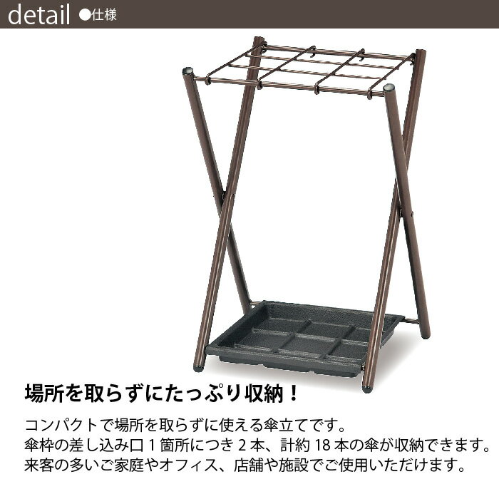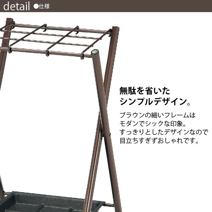 商品情報サイズ約幅305×奥行325×高さ510mm受皿サイズ約幅220×奥行290mmフレームスチール(φ19.1mm)、粉体塗装(ブラウン)受皿樹脂成型品(ブラック)傘枠スチール、粉体塗装(ブラウン)収納目安傘約18本収納可能組立区分完成品(一部組立)同シリーズ● 傘立て 18本収納● 傘立て 30本収納※このページは[傘立て 18本収納]を販売しております。